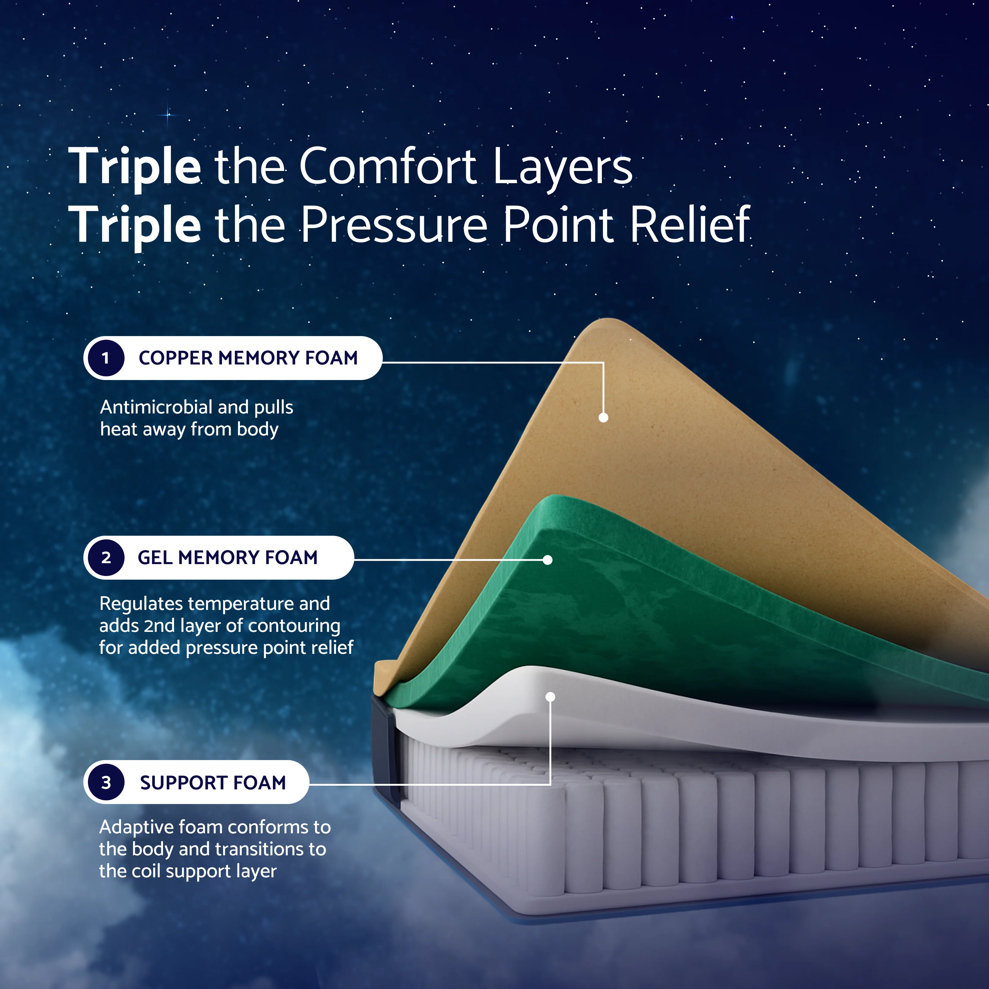 The secret to lasting back pain relief lies in our OrthoFlex Tri-Zone Coils™. These individually wrapped coils are "zoned" to provide targeted support. The middle third of the coils, where your body is heaviest, is slightly firmer to ensure your spine stays perfectly aligned. No more waking up in the dreaded "reverse rainbow" shape—with your midsection lower than your head and feet. Just pure, neutral spinal alignment that supports your body's natural curves.